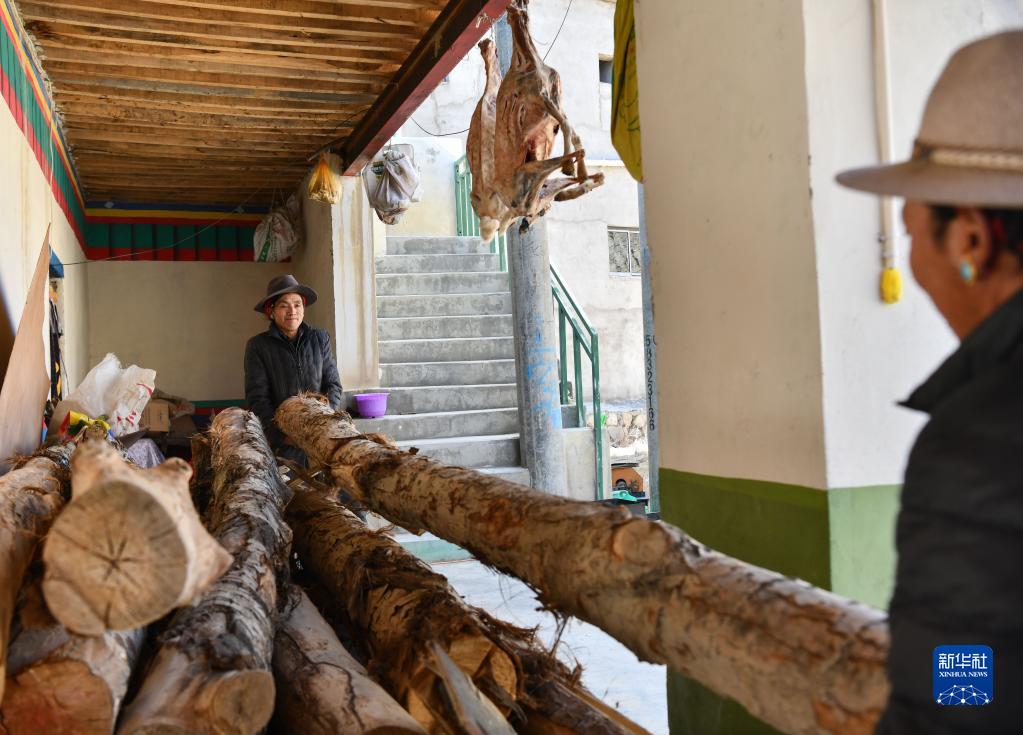 索朗瓊拉(左)和助手在挑選制作扎念琴的木材原料(1月19日攝)。新華社記者 晉美多吉 攝