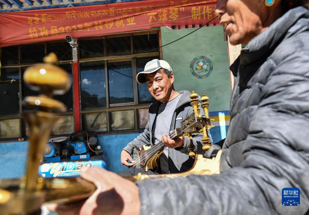 合作社的工匠在調(diào)試新制作的扎念琴(1月19日攝)。新華社記者 晉美多吉 攝