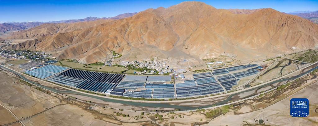 這是5月28日拍攝的白朗縣珠峰博覽園,目前園區(qū)共有高標準溫室大棚133座(無人機拼接照片)。新華社記者 姜帆 攝