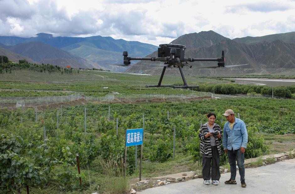 7月26日,桑日縣一家葡萄酒企業(yè)的員工曲珍(左)在葡萄園里向技術(shù)員何志榮學(xué)習(xí)使用農(nóng)用無人機(jī)。[詳細(xì)]