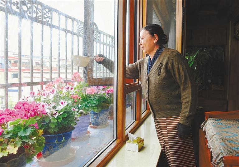 目前,西藏住房保障已覆蓋所有地市、縣(區(qū))和鄉(xiāng)鎮(zhèn),構(gòu)建了以周轉(zhuǎn)房、公共租賃住房(廉租房)為主體,推進城鎮(zhèn)棚戶區(qū)改造和城鎮(zhèn)老舊小區(qū)改造的住房保障體系,通過實物配租與租賃補貼并舉方式,基本實現(xiàn)了城鎮(zhèn)低保和低收入住房困難家庭應(yīng)保盡保。 圖為居住在拉薩市城關(guān)區(qū)加榮棚戶區(qū)小康安居園的央金,在家里澆花。記者 蔣蓋 攝
