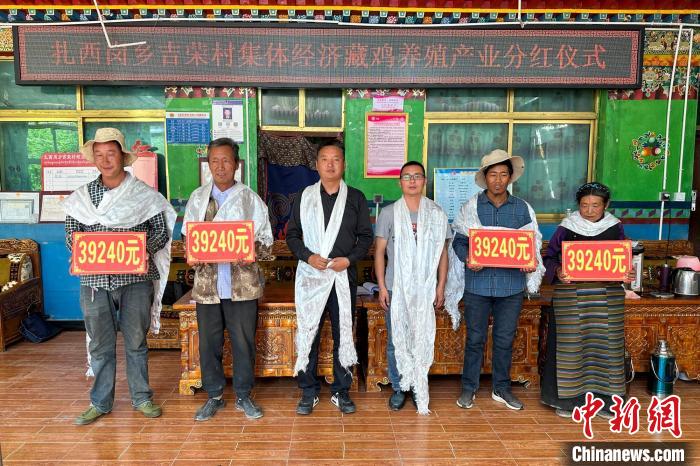 圖為分紅活動現(xiàn)場,吉榮村四個組代表領(lǐng)取藏雞養(yǎng)殖分紅。西藏自治區(qū)科技廳駐吉榮村工作隊 供圖