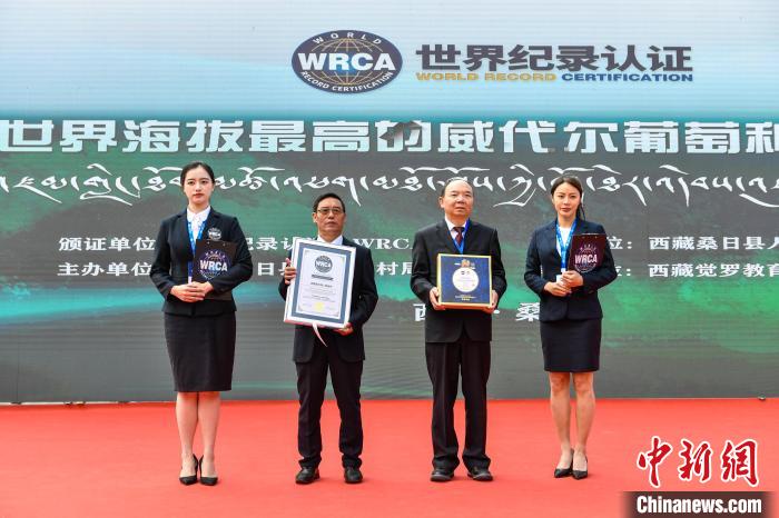 23日,經(jīng)世界紀(jì)錄認(rèn)證(WRCA)官方人員現(xiàn)場審核,西藏桑日縣被認(rèn)證為“世界海拔最高的威代爾葡萄種植基地”。