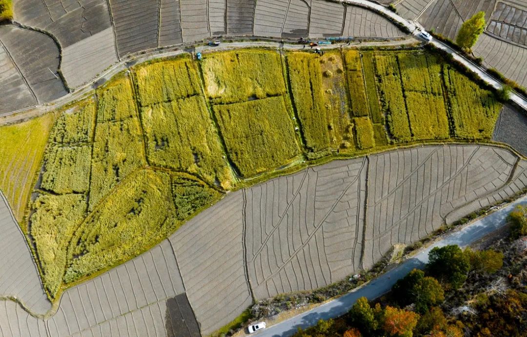 記者來(lái)到巴達(dá)村,放眼望去,稻田一片金黃,麥浪中群眾正揮舞著鐮刀,喜笑顏開(kāi)地收割著親手種植的谷物——一片20畝見(jiàn)方的高原水稻。