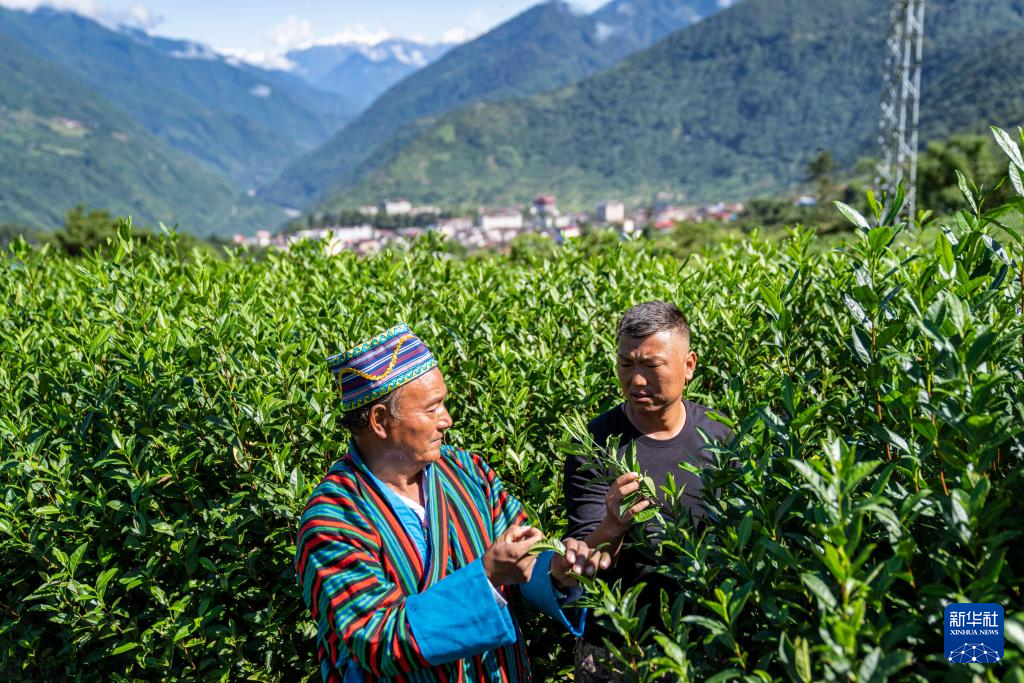 墨脫村村委會副主任達(dá)瓦次仁(右)查看茶葉生長情況(2023年10月13日攝)。新華社記者 孫非 攝