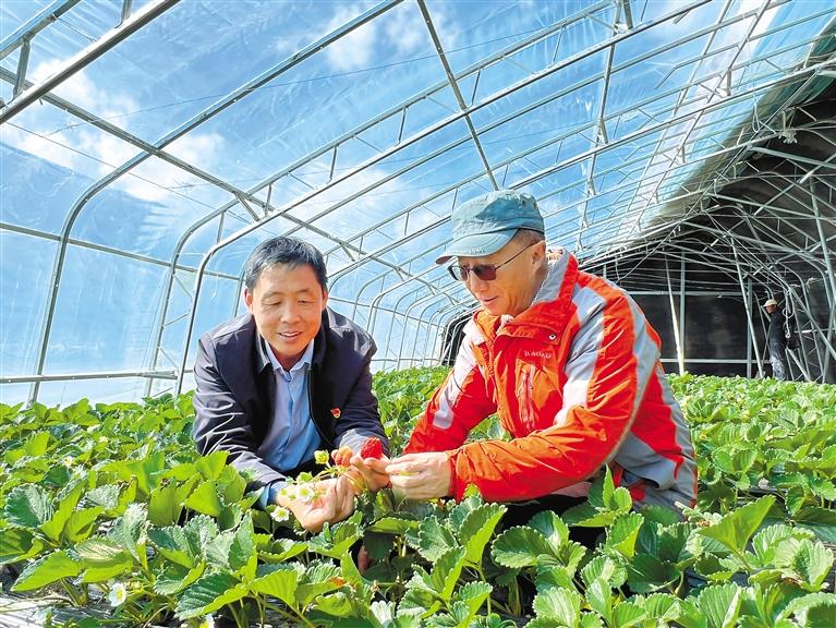 圖為基地蔬菜種植技術(shù)人員孟德利(左)與駐村干部一起查看草莓長勢。記者 汪純 攝