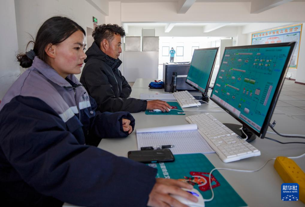 供暖工程的運維管理方申扎凈地市政管理有限公司經(jīng)理楊參奎(后)和同事在管理系統(tǒng)上監(jiān)控供暖系統(tǒng)運行(1月6日攝)。新華社記者 姜帆 攝