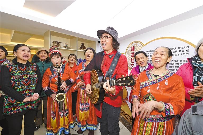“蟠龍社區(qū)生活著漢族、壯族、瑤族等15個民族的同胞,少數(shù)民族人口約占社區(qū)總?cè)丝诘?/3?!斌待埳鐓^(qū)黨委副書記許玉君介紹說,社區(qū)結(jié)合多民族“嵌入式”居住的特點,創(chuàng)新踐行“136”工作機制,即圍繞鑄牢中華民族共同體意識這條主線,通過加強黨的領(lǐng)導(dǎo)、織牢精神紐帶、用好治理平臺“三個抓手”,積極創(chuàng)造各民族共居共學(xué)、共建共享、共事共樂的“六共”條件,讓各族群眾像石榴籽一樣緊緊抱在一起?!拔沂菨h族,會做壯族的特色菜,我愛人是仫佬族,漢字書法練得有模有樣?!斌待埳鐓^(qū)藝術(shù)團骨干何繼榮老人說。