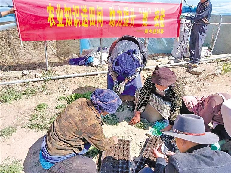 圖為曲水村婦女在學(xué)習(xí)育苗技術(shù)。 記者 格桑倫珠 攝