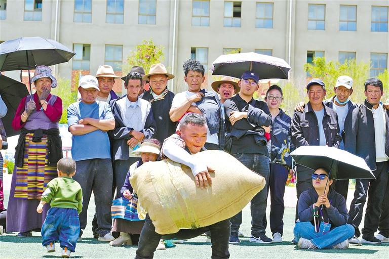圖為桑珠孜區(qū)城北街道舉辦慶祝第八個“日喀則市民族團(tuán)結(jié)進(jìn)步日”暨“全民來健身 健康你我他”社區(qū)運(yùn)動會。這是參賽選手在進(jìn)行抱石頭比賽。