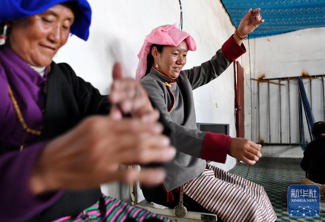 木托村婦委會主任措吉卓嘎在合作社院子里纏毛線(8月23日攝)。