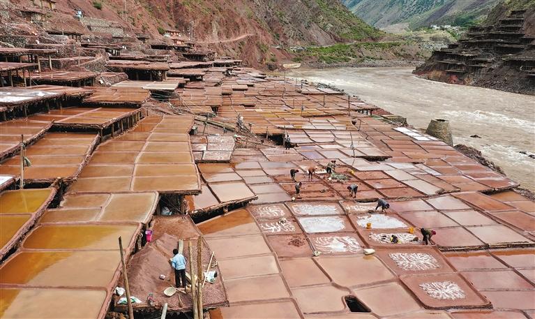 9月,瀾滄江的高山河谷坡地上,一年曬鹽季進入尾聲。昌都市芒康縣納西民族鄉(xiāng)加達村村民例行修補1300多歲的鹽田。據(jù)了解,加達村從事鹽業(yè)生產(chǎn)的有300多戶,有大小鹽田2700多塊。