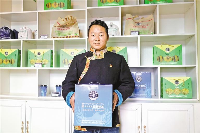 申藏村村民委員會副主任、鄉(xiāng)村振興專干久米旺久展示扎其申藏豐饒水磨糌粑合作社的產(chǎn)品。記者 頓珠扎西 攝