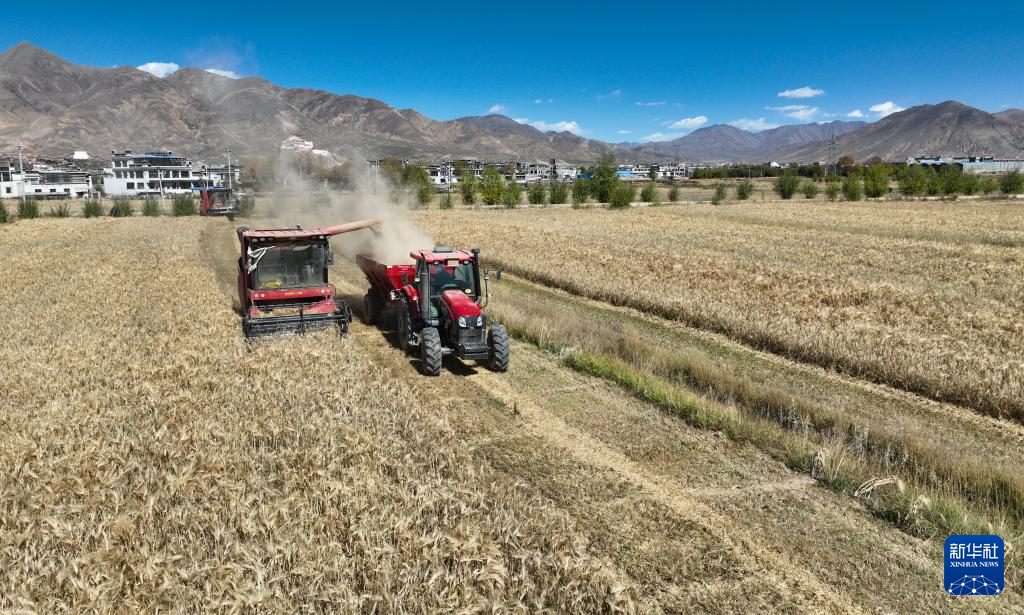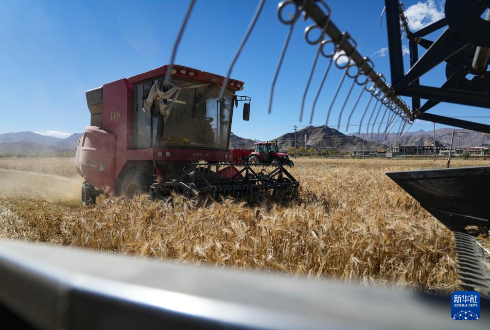 西藏日喀則市江孜縣江熱鄉(xiāng)班覺倫布村農(nóng)機服務(wù)農(nóng)民專業(yè)合作社的社員使用農(nóng)機收獲青稞(10月16日攝)。新華社記者 晉美多吉 攝