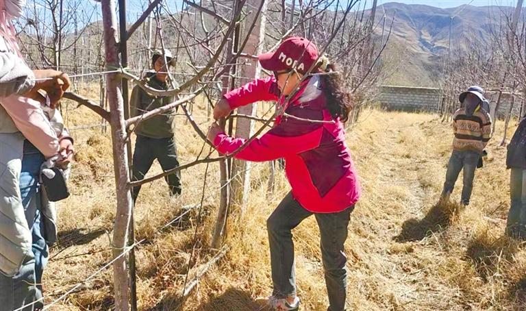 圖為德吉向果農(nóng)演示如何科學合理修剪蘋果樹。記者 孫開遠 攝