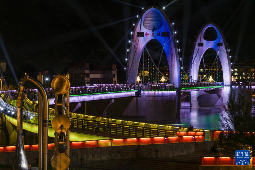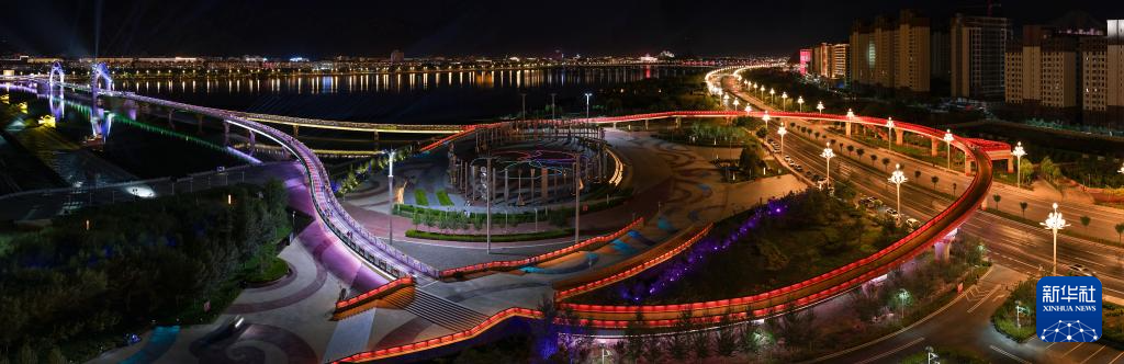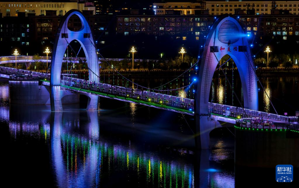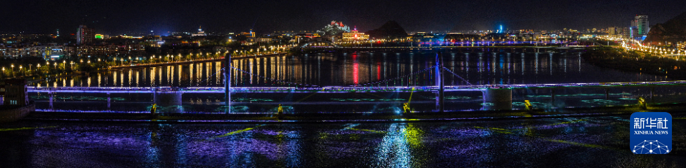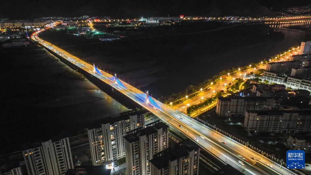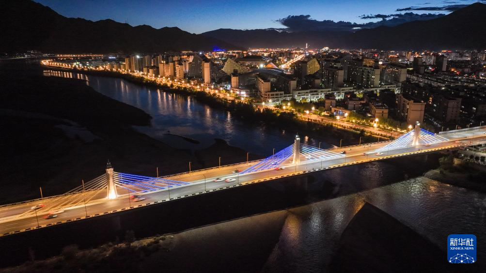 這是7月30日拍攝的拉薩河夜景,由近及遠(yuǎn)分別是和美橋、柳梧大橋和連心橋(無人機(jī)拼接照片)。新華社記者 姜帆 攝
