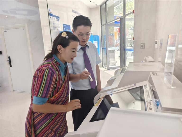 中國建設銀行墨脫支行開業(yè)當天,工作人員成功為當地門巴族客戶在智慧柜員機上辦理首筆業(yè)務。