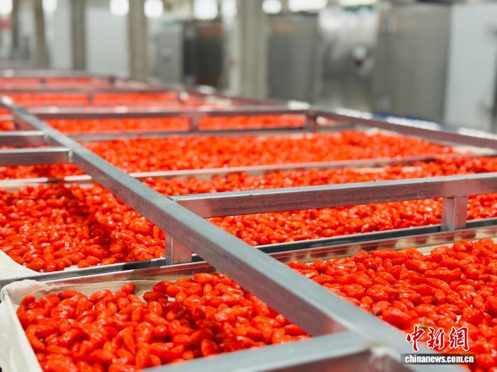圖為青海省格爾木農(nóng)墾集團(tuán)枸杞生產(chǎn)線,工人們正在收集采用鎖鮮工藝烘干的枸杞。孫睿 攝