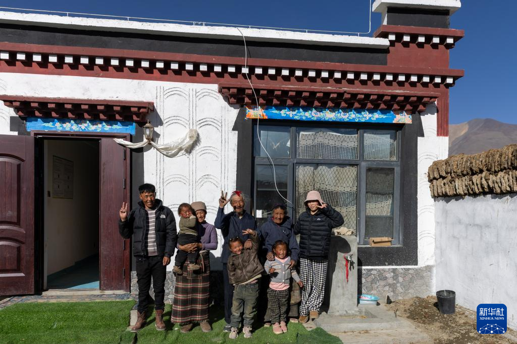 次仁拉姆(左二)和家人在新居前合影(1月5日攝)。新華社記者 姜帆 攝