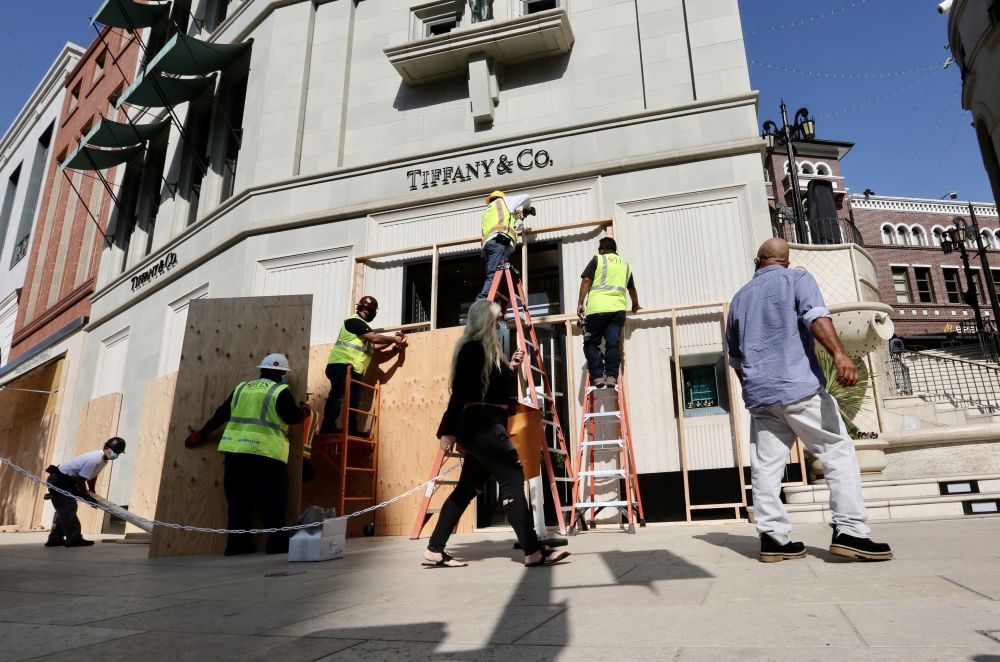 2020年11月2日,美國洛杉磯縣貝弗利山市商業(yè)區(qū)的商家將店鋪門窗封上。為應(yīng)對當(dāng)時美國大選可能出現(xiàn)的抗議或騷亂,貝弗利山市不少商業(yè)區(qū)加強防護(hù)和安保。 新華社發(fā)