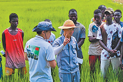 中國(guó)農(nóng)業(yè)專家為科特迪瓦農(nóng)民進(jìn)行水稻病蟲防治的培訓(xùn)。
