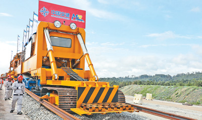 在馬來西亞彭亨州關(guān)丹市馬東鐵項(xiàng)目現(xiàn)場(chǎng),鋪軌機(jī)正在作業(yè)。