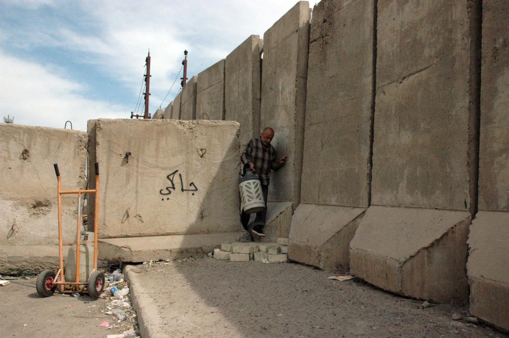 2013年3月20日,在伊拉克首都巴格達,一名伊拉克人從防爆墻的縫隙之間穿過。新華社發(fā)(巴沙爾攝)