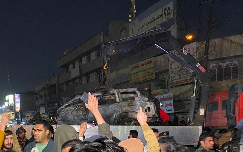 2024年2月7日,在伊拉克首都巴格達,民防部門轉(zhuǎn)移遭無人機襲擊的車輛。新華社發(fā)(哈利勒·達伍德攝)