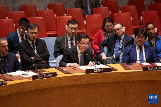 4月14日,在位于紐約的聯(lián)合國總部,中國常駐聯(lián)合國代表團(tuán)臨時代辦戴兵(前中)在安理會就伊朗襲擊以色列舉行的緊急會議上發(fā)言。新華社記者 謝鍔 攝