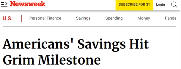 美國(guó)富國(guó)銀行(Wells Fargo)分享給《新聞周刊》(Newsweek)的一份分析報(bào)告顯示,美國(guó)人的儲(chǔ)蓄速度正在下降,達(dá)到一年多來(lái)的最低水平。與此同時(shí),另一項(xiàng)調(diào)查指出,近38%的美國(guó)人不得不動(dòng)用儲(chǔ)蓄或求助家人朋友以應(yīng)對(duì)日常支出。有超過(guò)半數(shù)的美國(guó)人認(rèn)為通脹是美國(guó)當(dāng)前面臨的一個(gè)比移民和犯罪等更大的問(wèn)題。