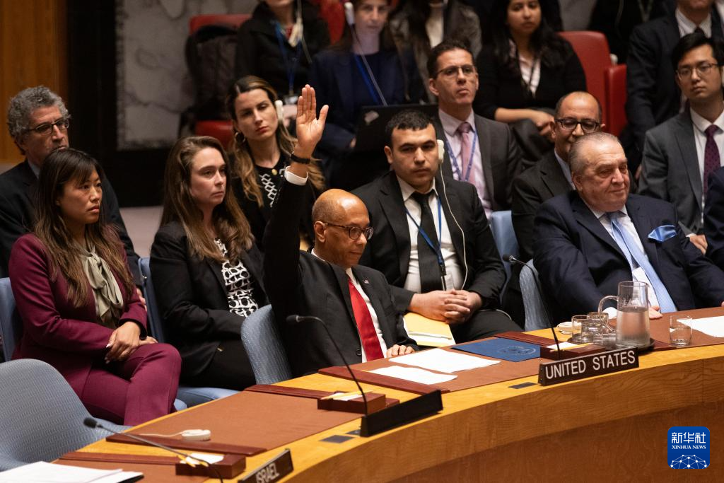 4月18日,在位于紐約的聯(lián)合國(guó)總部,美國(guó)常駐聯(lián)合國(guó)副代表羅伯特·伍德(前左)在安理會(huì)就決議草案進(jìn)行表決時(shí)投反對(duì)票。新華社記者 謝鍔 攝