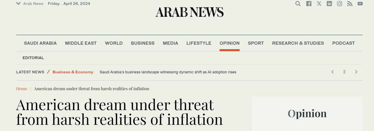 沙特阿拉伯媒體《阿拉伯新聞》網(wǎng)站4月24日刊發(fā)評論文章稱,美國通脹高企,物價(jià)不斷上漲,導(dǎo)致民眾的購買力持續(xù)下降,基本生活消費(fèi)品成為無力負(fù)擔(dān)的“奢侈品”?!懊绹鴫簟北粴埧岬默F(xiàn)實(shí)擊潰。文章批評美國政府對通脹危機(jī)的反應(yīng)嚴(yán)重不足,將黨派問題置于解決民眾的迫切需求之上,削弱了民眾的信任感。