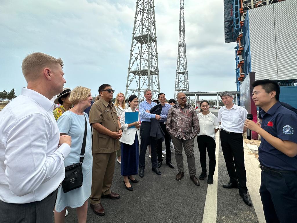 23日下午,使節(jié)團(tuán)走進(jìn)了正在建設(shè)中的海南國(guó)際商業(yè)航天發(fā)射中心現(xiàn)場(chǎng),站在已經(jīng)竣工的一號(hào)發(fā)射工位旁,使節(jié)們紛紛掏出手機(jī),從不同角度拍攝高聳入云的發(fā)射塔架。不等工作人員講解,不少使節(jié)圍上前問(wèn)出心中的好奇。