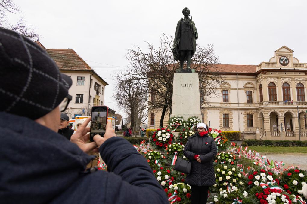 2023年3月15日,匈牙利首都布達佩斯和裴多菲出生地小克勒什舉行慶?;顒?,紀念1848年革命和自由斗爭175周年。圖為民眾當日在小克勒什的裴多菲雕像前拍照留念。新華社發(fā)(弗爾季·奧蒂洛攝)