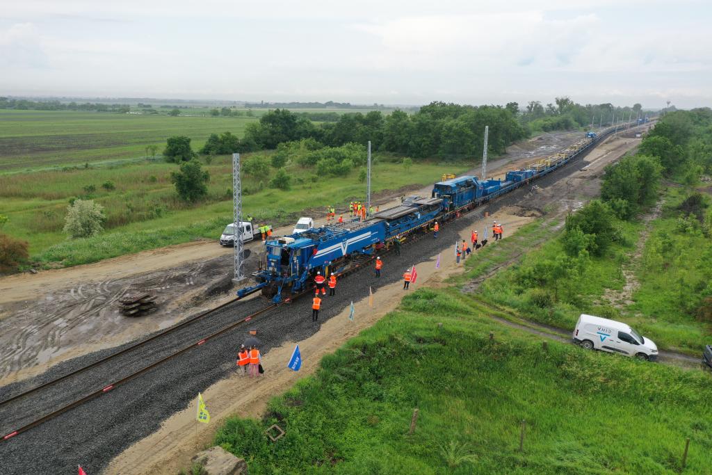 2023年5月30日,匈塞鐵路匈牙利段孔圣米克洛什-陶什站至伯斯特爾站區(qū)間首對鋼軌開始鋪設。圖為當天孔圣米克洛什-陶什站施工現(xiàn)場(無人機照片)。新華社發(fā)(中國中鐵匈塞鐵路項目經理部供圖)