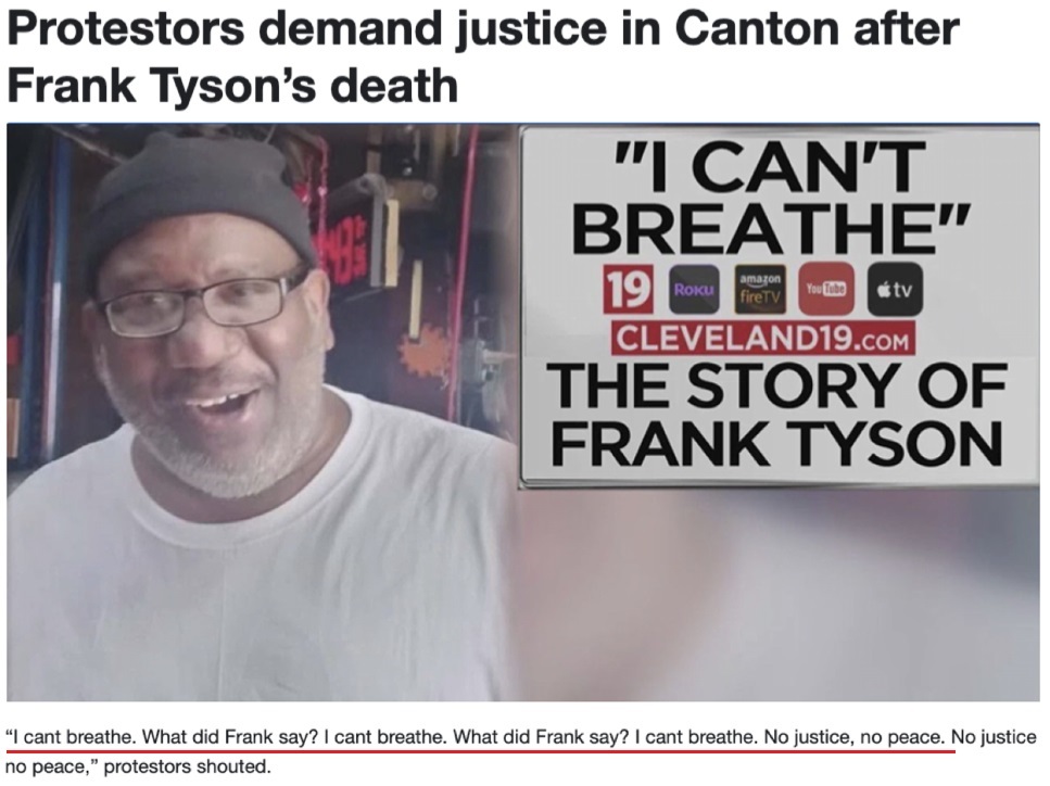 “我無(wú)法呼吸。弗蘭克說(shuō)了什么?我無(wú)法呼吸。弗蘭克說(shuō)了什么?我無(wú)法呼吸。沒(méi)有正義,就沒(méi)有和平!”