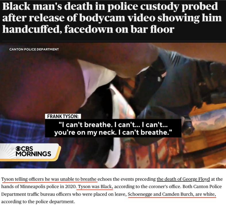 有美媒提到 ,泰森和弗洛伊德都是在遭到警察用膝蓋跪壓后死亡的,而且兩人的最后一句話(huà)都是“我無(wú)法呼吸”。