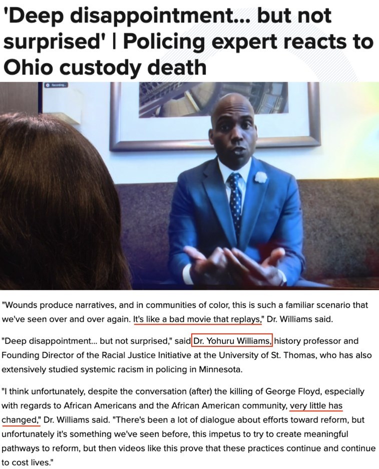 長(zhǎng)期從事種族研究的美國(guó)圣托馬斯大學(xué)歷史學(xué)教授、該校種族正義計(jì)劃發(fā)起人約胡魯·威廉姆斯在接受采訪(fǎng)時(shí)表示,他對(duì)泰森遇害深感失望,但并不驚訝。