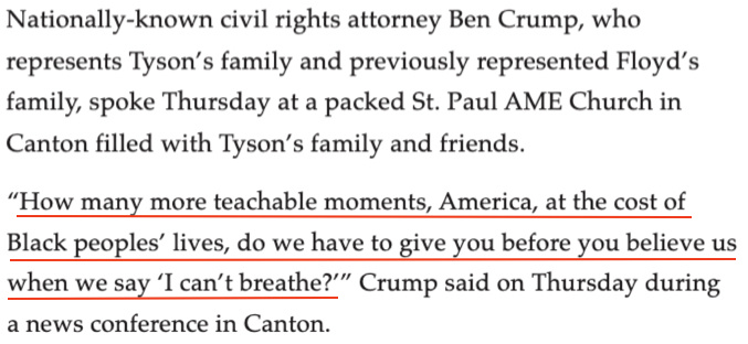 正如代表泰森家人的律師之一鮑比·迪塞洛所言,這起事件就是“喬治·弗洛伊德2.0版”。