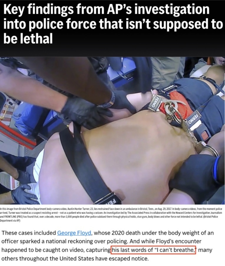 美聯(lián)社不久前主導(dǎo)的一項(xiàng)調(diào)查發(fā)現(xiàn),在2012年至2021年的十年間,美國(guó)警察使用身體約束、電擊、毆打等所謂“非致命性手段”導(dǎo)致至少1036人死亡,平均每周兩人。