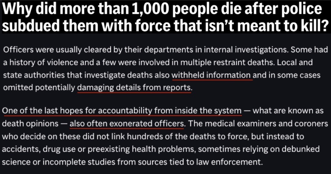 而作為內(nèi)部問(wèn)責(zé)的最后希望之一,法醫(yī)和驗(yàn)尸官提供的所謂“死亡意見(jiàn)”也經(jīng)常為警察開(kāi)脫,一些明顯與警察暴力執(zhí)法相關(guān)的死亡,會(huì)被他們歸因于事故、吸毒或先前存在的健康問(wèn)題。