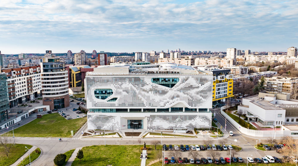這是2023年12月29日在塞爾維亞首都貝爾格萊德航拍的貝爾格萊德中國文化中心大廈。