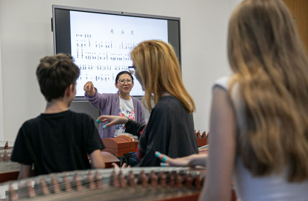 2024年4月29日,在貝爾格萊德中國文化中心,古箏指導(dǎo)老師王宣(后)在教學(xué)。