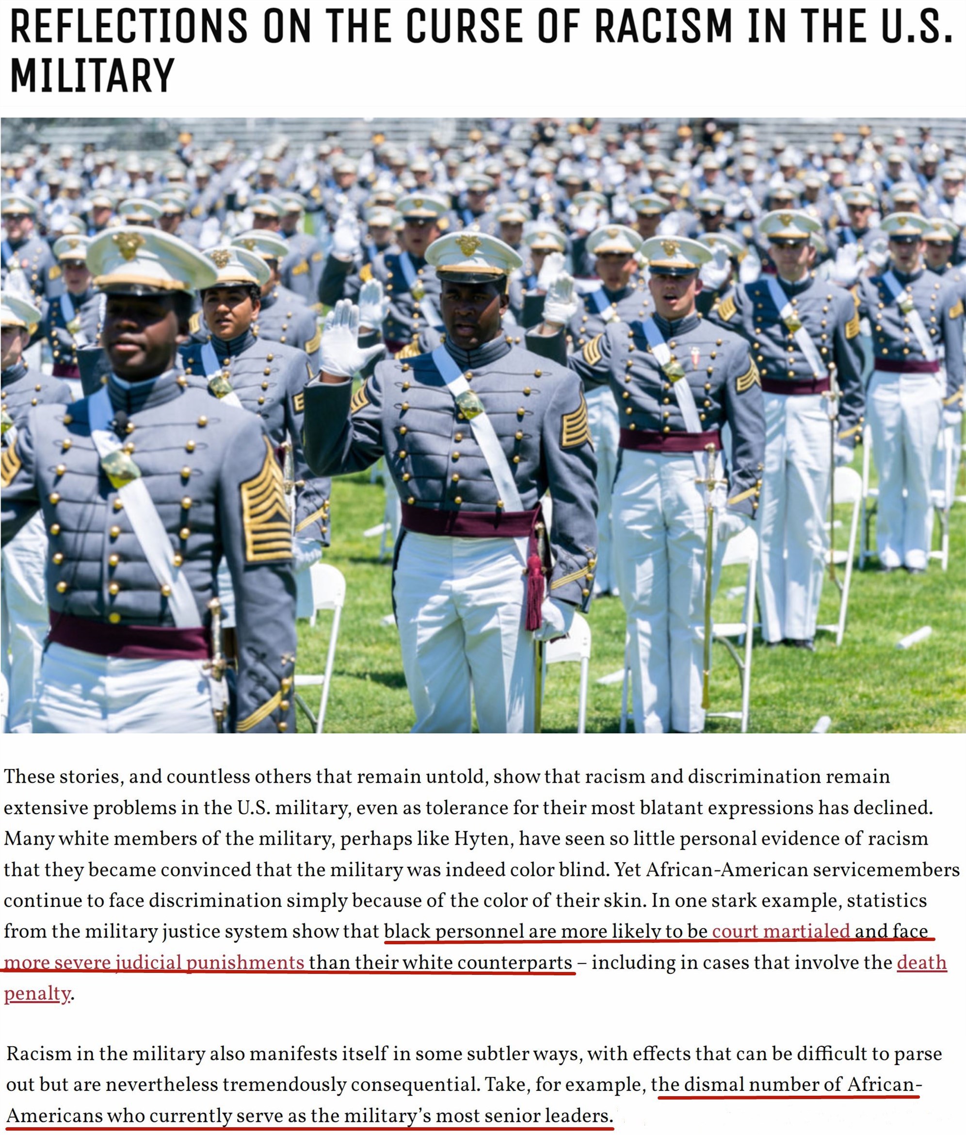 曾有多位美國軍方非裔高官對媒體表示,自己在長期的軍旅生涯中飽受歧視。