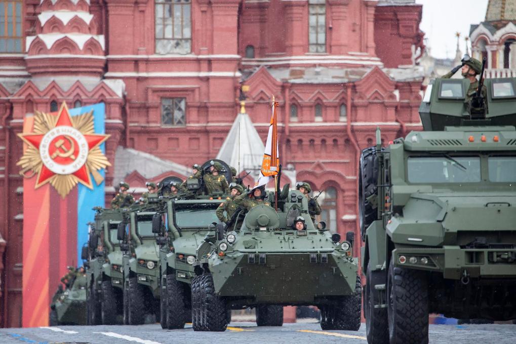 5月9日,在俄羅斯首都莫斯科,軍車編隊(duì)駛過紅場。新華社記者曹陽攝