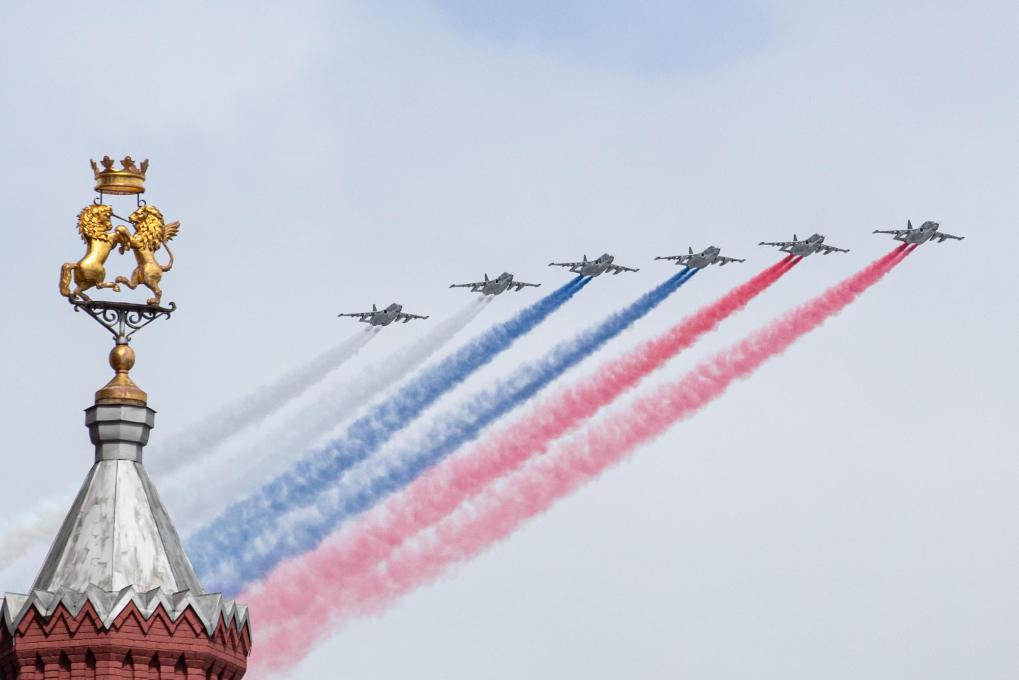 5月9日,在俄羅斯首都莫斯科,蘇-25攻擊機(jī)編隊(duì)在紅場上空飛過。新華社記者白雪騏攝