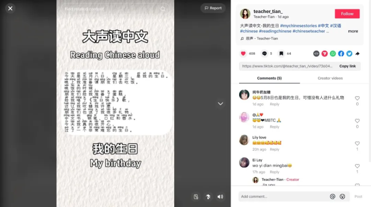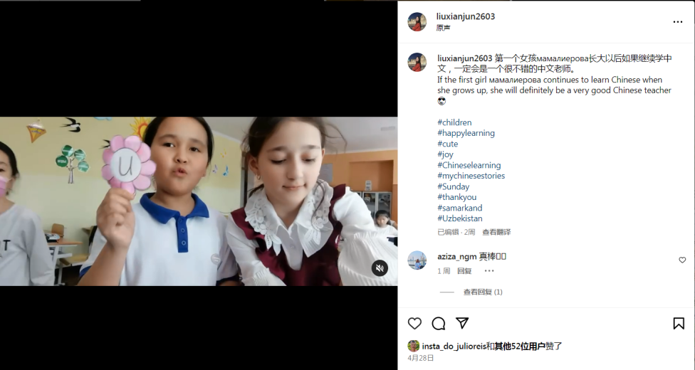 來(lái)自老撾的楊世群、菲律賓的黃玉潔、布隆迪的田曉慧和墨西哥的楊衍輝等老師,還分享了各種學(xué)習(xí)中文的有趣方法,例如情景演繹、唱歌學(xué)中文、跟讀練習(xí),獲得了網(wǎng)友們的一致好評(píng)。