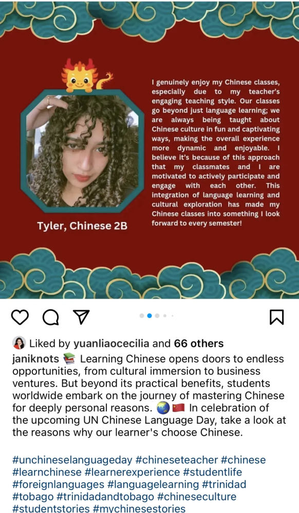 第十五個(gè)聯(lián)合國(guó)中文日和第五個(gè)“國(guó)際中文日”舉辦期間,中外語(yǔ)言交流合作中心與中國(guó)日?qǐng)?bào)網(wǎng)聯(lián)合發(fā)起 “國(guó)際中文日”系列線上活動(dòng),鼓勵(lì)大家講述、分享與中文相遇的精彩故事,半個(gè)月內(nèi)活動(dòng)參與者覆蓋全球五大洲近70個(gè)國(guó)家和地區(qū),包括英國(guó)、意大利、澳大利亞、美國(guó)、巴西、日本、韓國(guó)、泰國(guó)、老撾、迪拜、喀麥隆等,作品超2000件,閱讀量超1000萬(wàn),在中國(guó)和其他國(guó)家主流社交媒體平臺(tái)掀起“中文日”熱潮,吸引了海內(nèi)外網(wǎng)友的廣泛關(guān)注。
