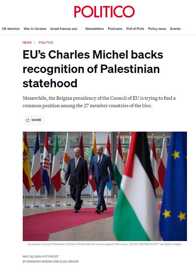 據(jù)《政客網(wǎng)》歐洲版28日報(bào)道,盡管歐洲各國政府在何時(shí)或是否承認(rèn)巴勒斯坦國問題上仍然存在分歧,但歐洲理事會(huì)主席查爾斯·米歇爾表示他將支持這一舉措。