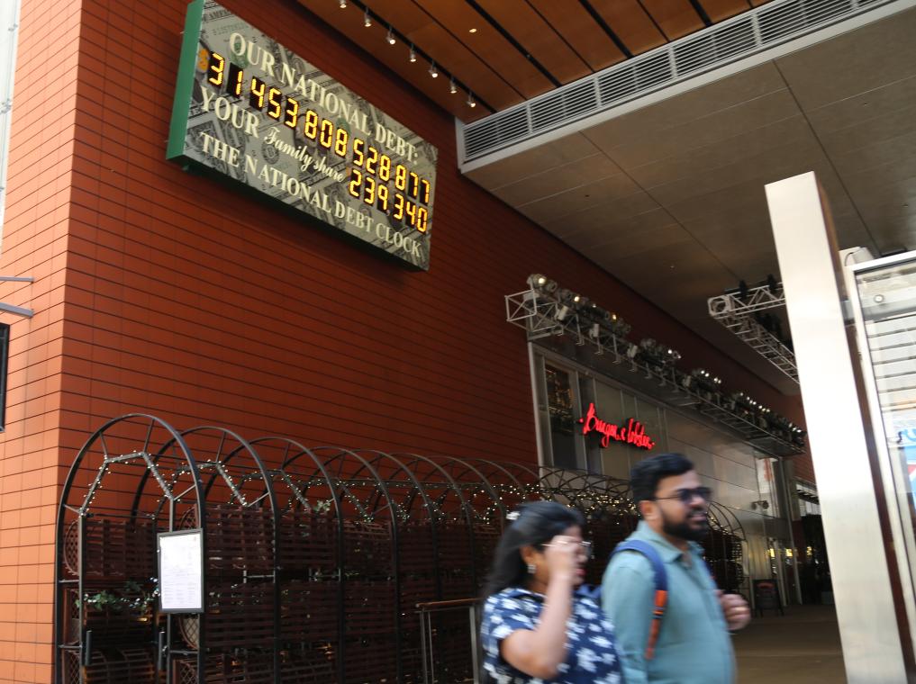 2023年5月29日,人們經(jīng)過美國紐約曼哈頓的“國債鐘”?!皣鴤姟笔且粋€大型計(jì)數(shù)器,它實(shí)時更新美國的公共債務(wù)總額,并顯示出每個美國家庭所要負(fù)擔(dān)的數(shù)額。新華社記者劉亞南攝